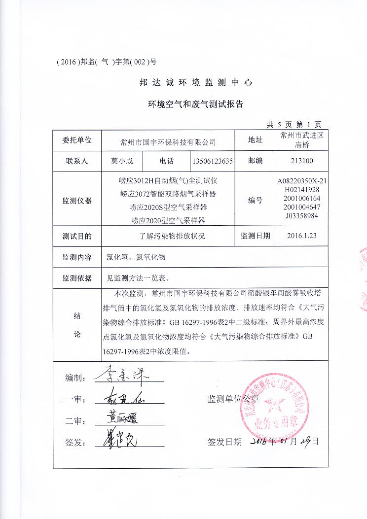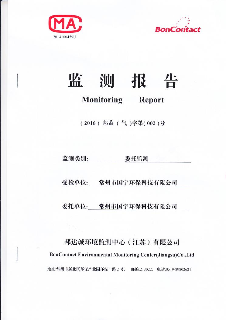2016年常州市國宇環(huán)??萍加邢薰練獗O(jiān)測報告網(wǎng)上公示